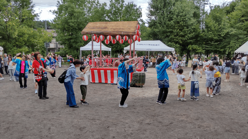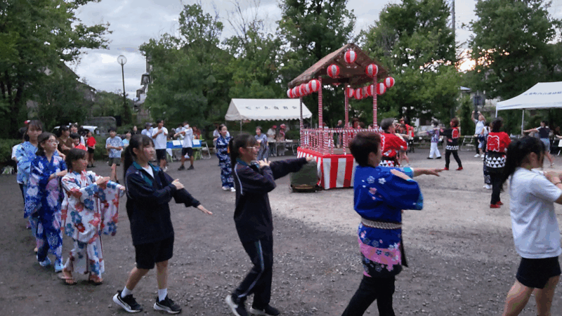 17時からは吾妻民踊レクリエーションクラブの協力のもと、中央の櫓を中心に踊りが始まり、大きな踊りの輪ができ、お祭りは最高潮に達しました。