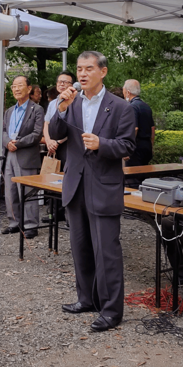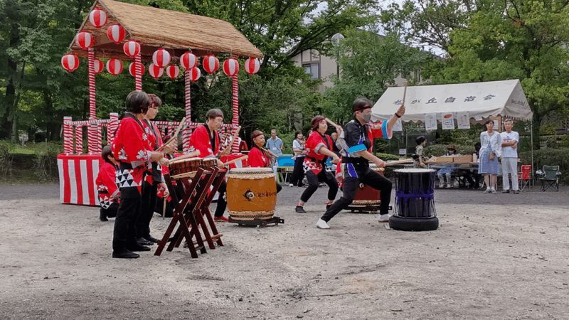16時15分から第1会場で松が丘太鼓サークルによる勇壮な八丈島太鼓の演奏が始まり、お祭りは一気に盛り上がりました。松本自治会長の開会の挨拶があり、続いてご来賓の小野塚市長と柴山衆議院議員からご挨拶をいただきました。