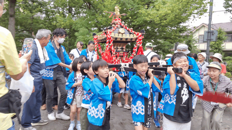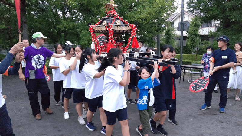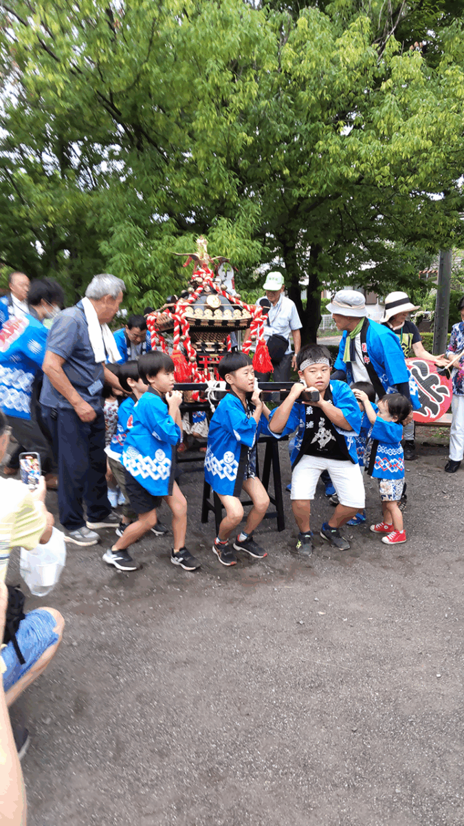 17時45分からは新企画のお神輿担ぎ体験として、お子さんたちを集めて子ども神輿を担ぎました。祭りの最後なので参加者が集まるか危惧しましたが、小さいお子さん、中学生の組に分かれ、それぞれ元気に会場を2周しました。