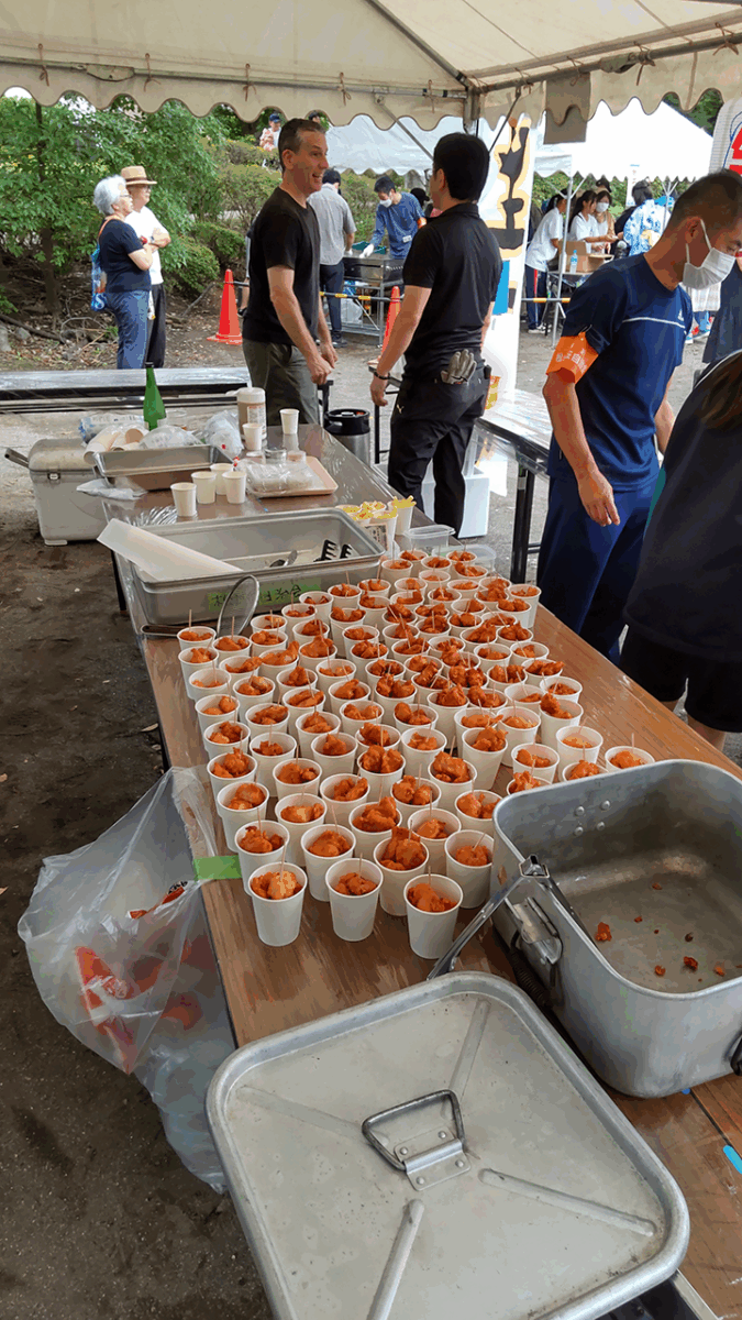 16時30分から鐘の合図とともに夜店が開店しました。ビール、チューハイなどの飲み物、看板メニューの焼きそばの他、購入品の団子、コロッケ、塩アンパン、今年はコロナ禍以前のフランクフルトの復活と大学芋を新規に販売しました。また、活動部有志により、生ビール、フライドポテト、唐揚げが販売されました。それぞれ、長い行列ができ、途中で売り切れる物もありました。