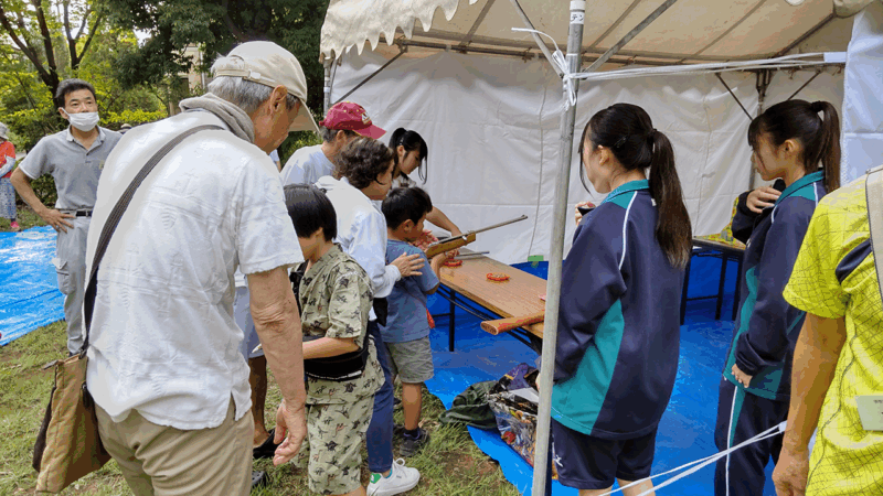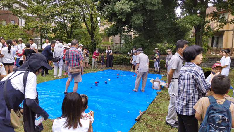 お祭りは、15時から第2会場でキッズコーナーが開催され、くじ、綿あめ、ポップコーン、子ども飲物・菓子の販売、ボッチャ体験、ヨーヨー釣り、射的ゲームなどの他、今年から竹の水鉄砲製作が行われました。多くのお子さんたちで大盛況でした。